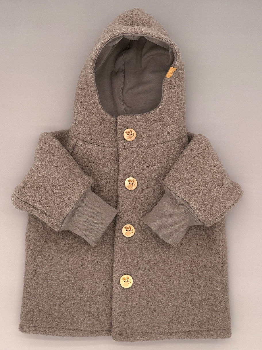 Eine bezaubernde, hochwertige Jacke aus feinster Schurwolle in sanftem Schlamm. Ausgestattet mit einem kuscheligen Innenfutter und edlen Holzknöpfen - perfekt für kleine Naturfreunde, die Komfort und Stil lieben. Die Terra Jacke vereint Qualität, Wärme und zeitlose Eleganz in einem Stück.